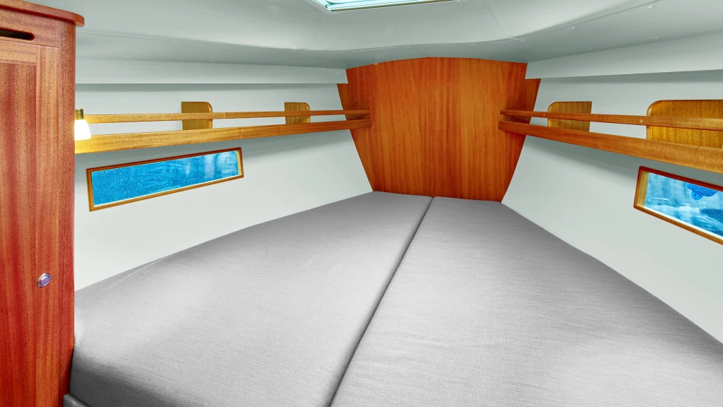 The Faurby 360 DS has one feature that you won’t find on our other DS models: in the standard layout the owner’s cabin is in the forepeak. This arrangement gives her owners the maximum amount of headroom and space, plus a large en suite heads and shower compartment (which isn’t possible in the aft suite on a yacht of this size). It’s a layout that gives you the space and privacy you’d expect from a much bigger yacht and provides your guests, friends or family with a large aft cabin.