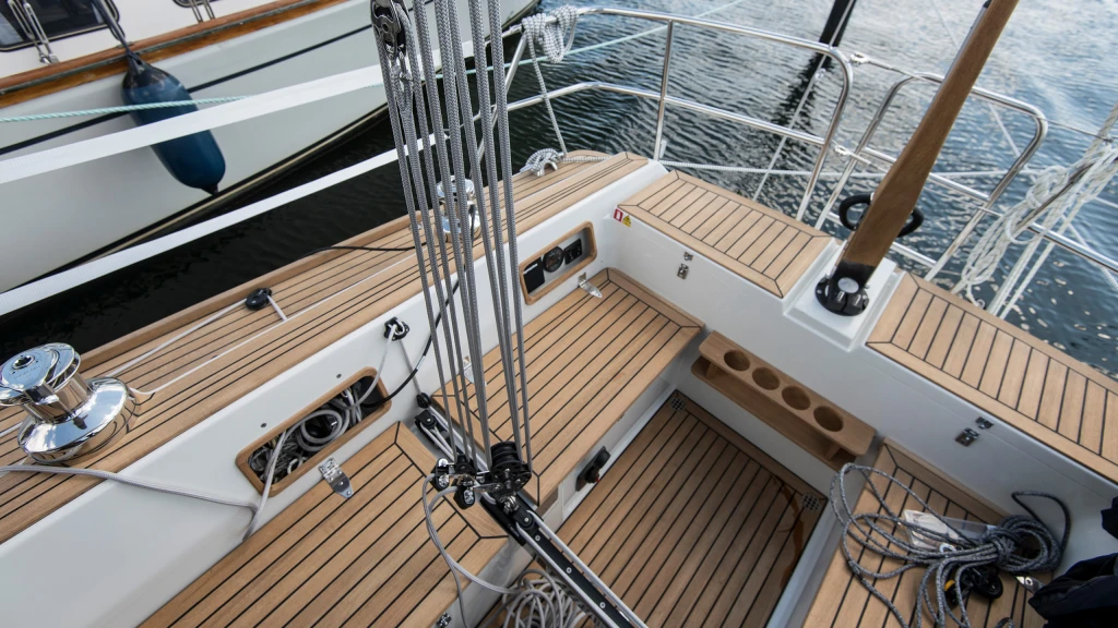 On deck, the lines from the mast are led under the deck to keep the coachroof free of clutter and keep them protected from dirt and UV light. There is the option of a sprayhood, which stows neatly into a dedicated reccess forward of the companionway.